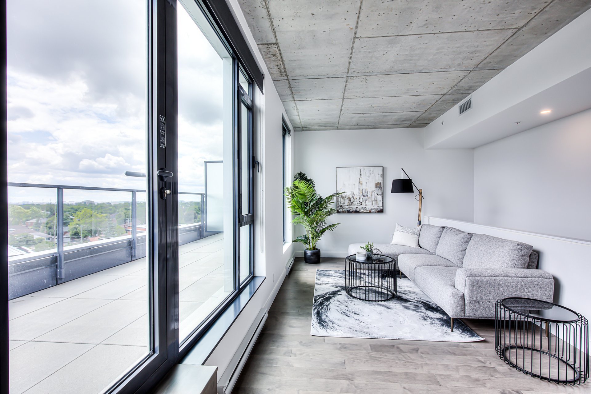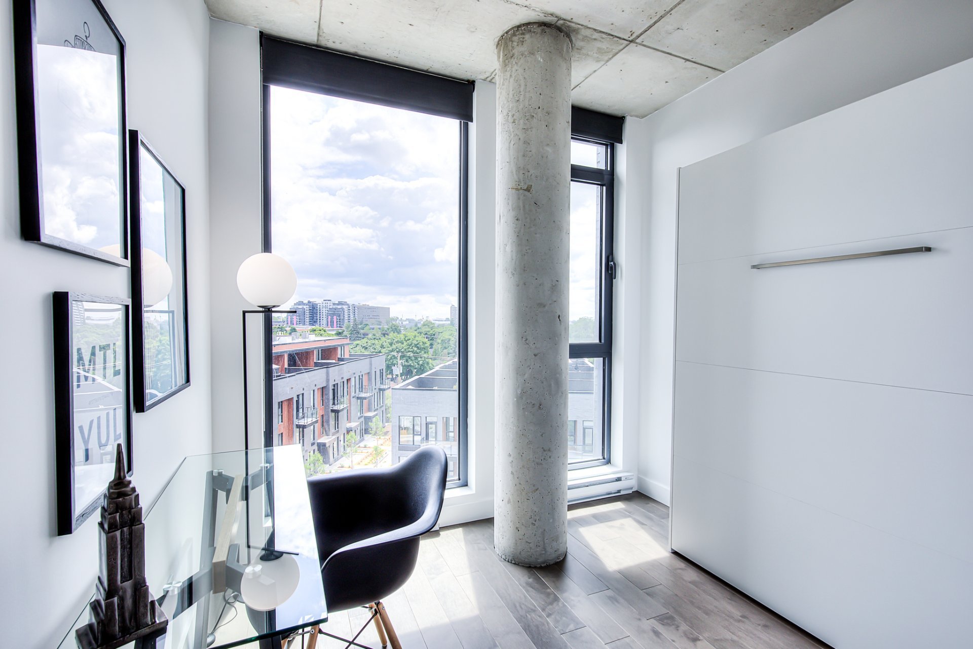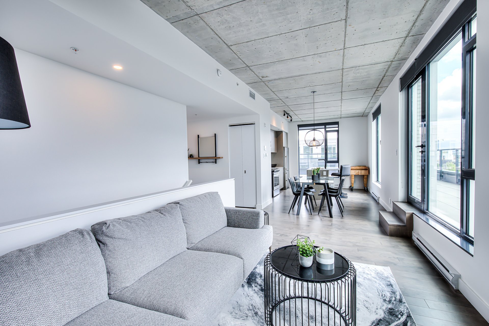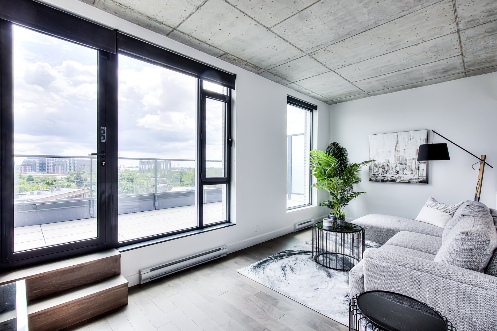 Top floor, corner unit, extremely bright and impeccably furnished! Ideal for professional, executive working downtown! Stunning 2 story appartement, with living space on top floor, open view, nice 400sf private terrace. Master bedroom with walk-in closet, and 2nd bedroom (or office) on the 1 st level. Condo is brand new!