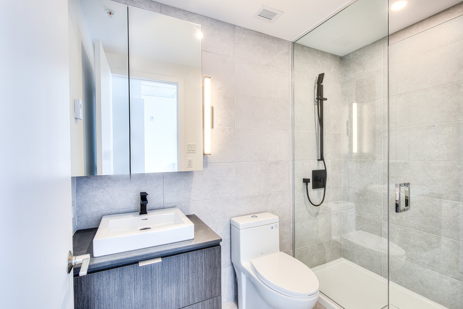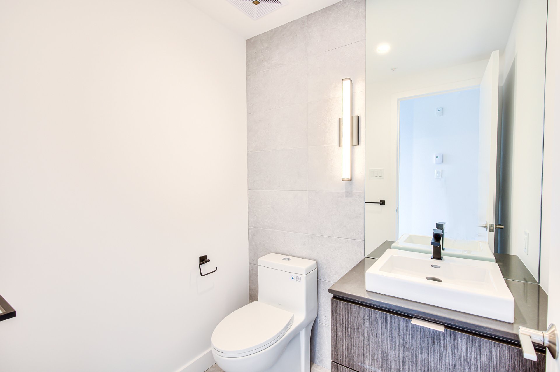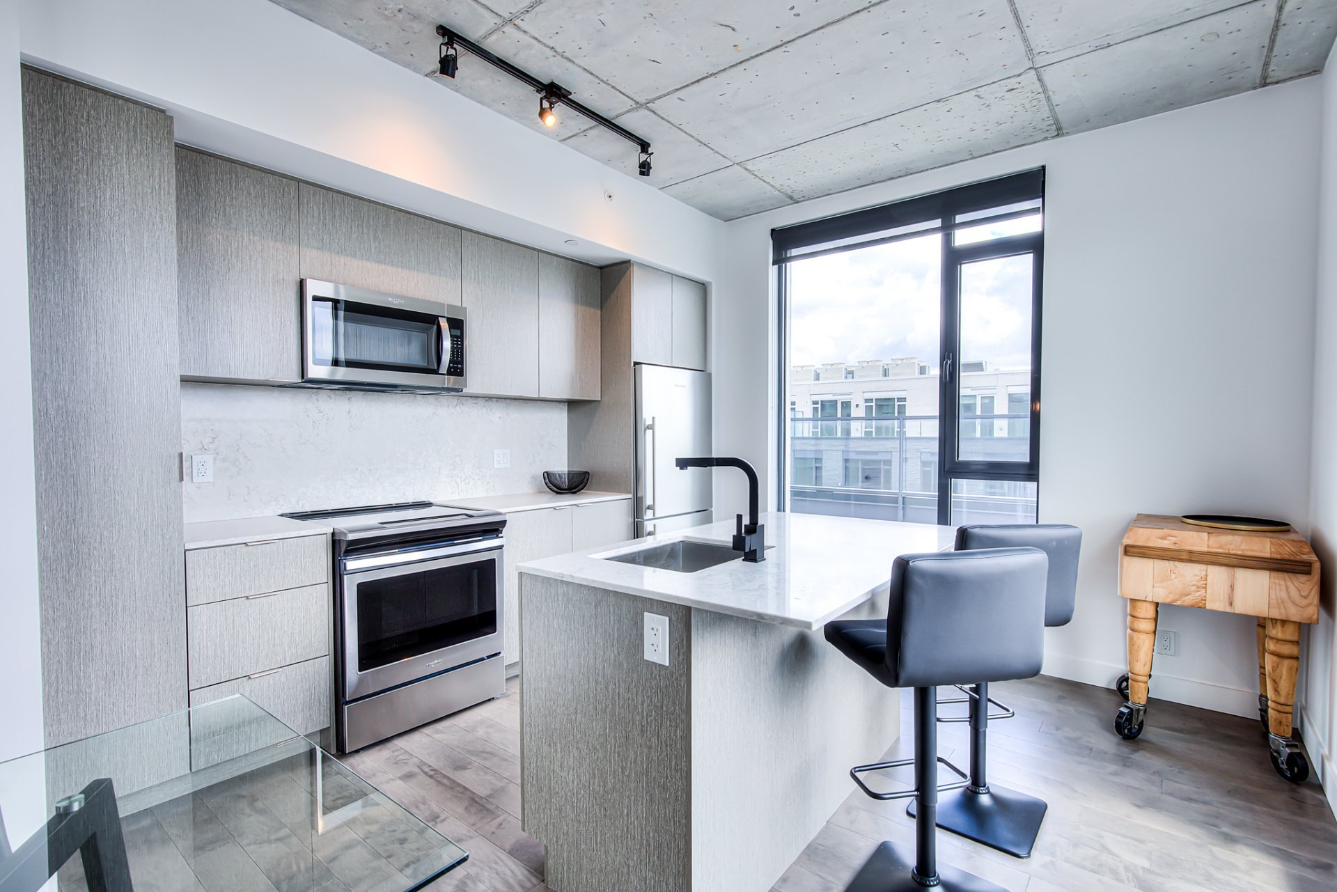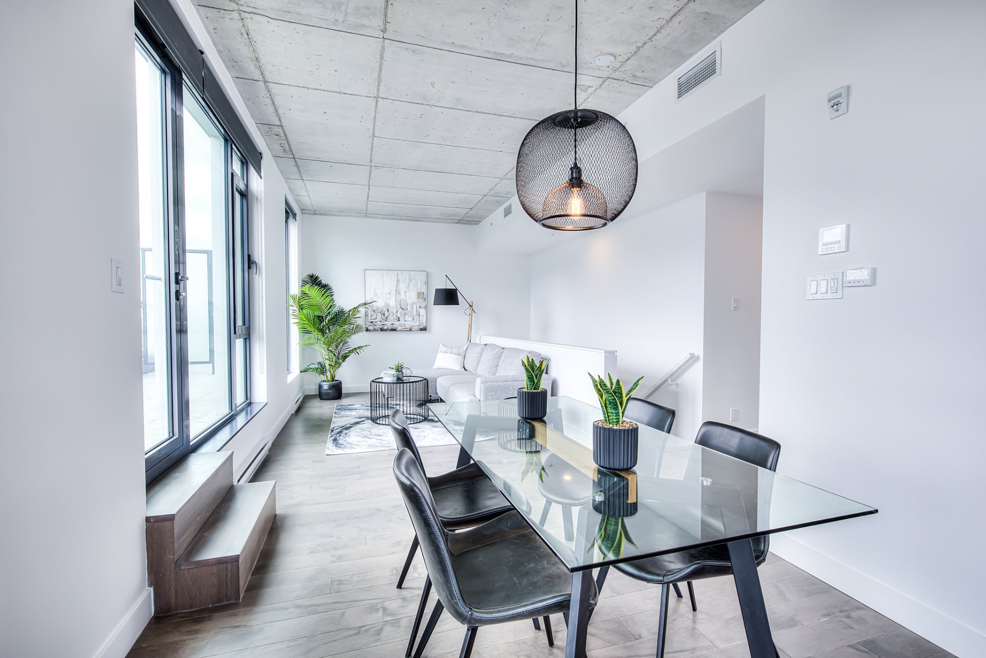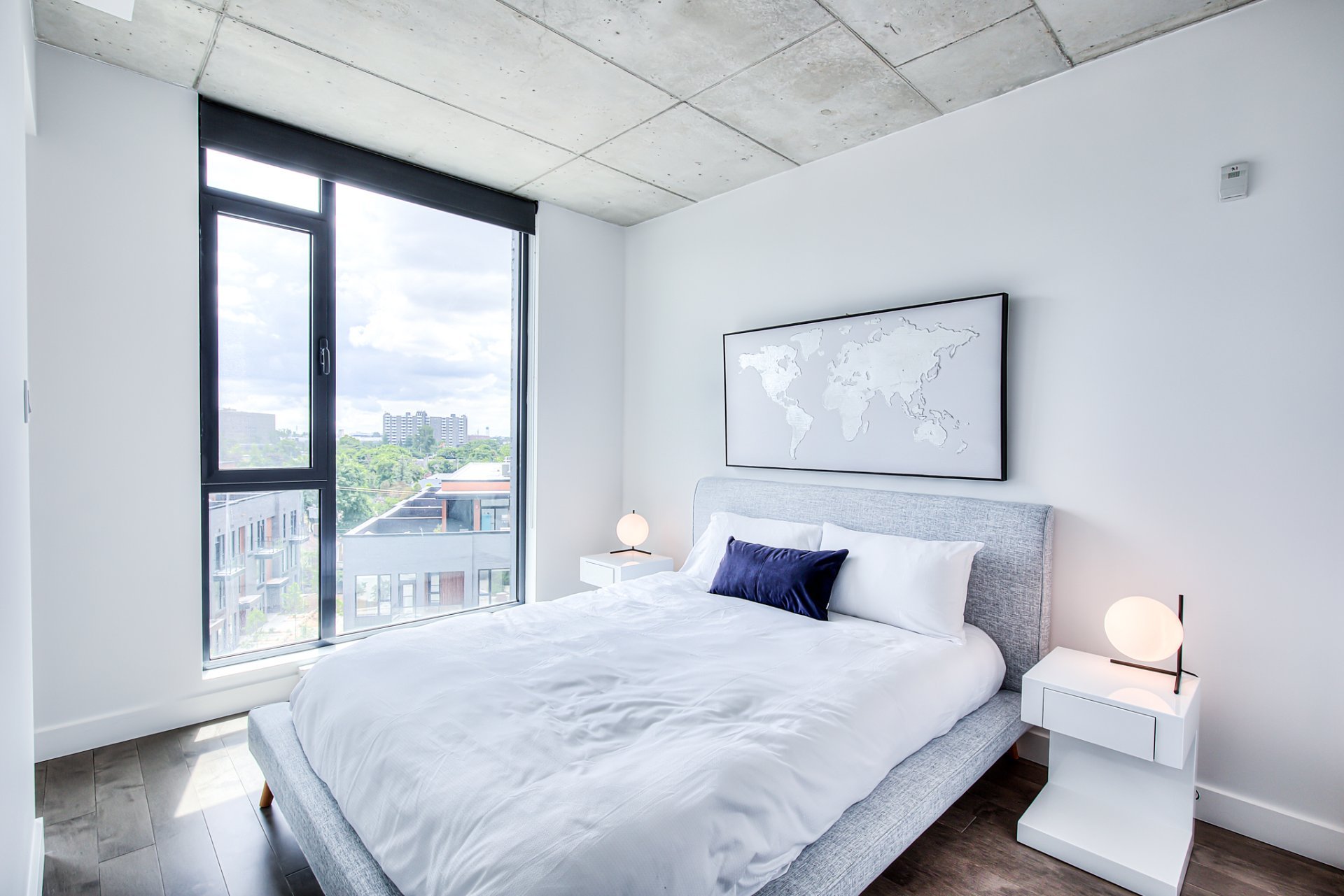 Top floor, corner unit, extremely bright and impeccably furnished! Ideal for professional, executive working downtown! Stunning 2 story appartement, with living space on top floor, open view, nice 400sf private terrace. Master bedroom with walk-in closet, and 2nd bedroom (or office) on the 1 st level. Condo is brand new!