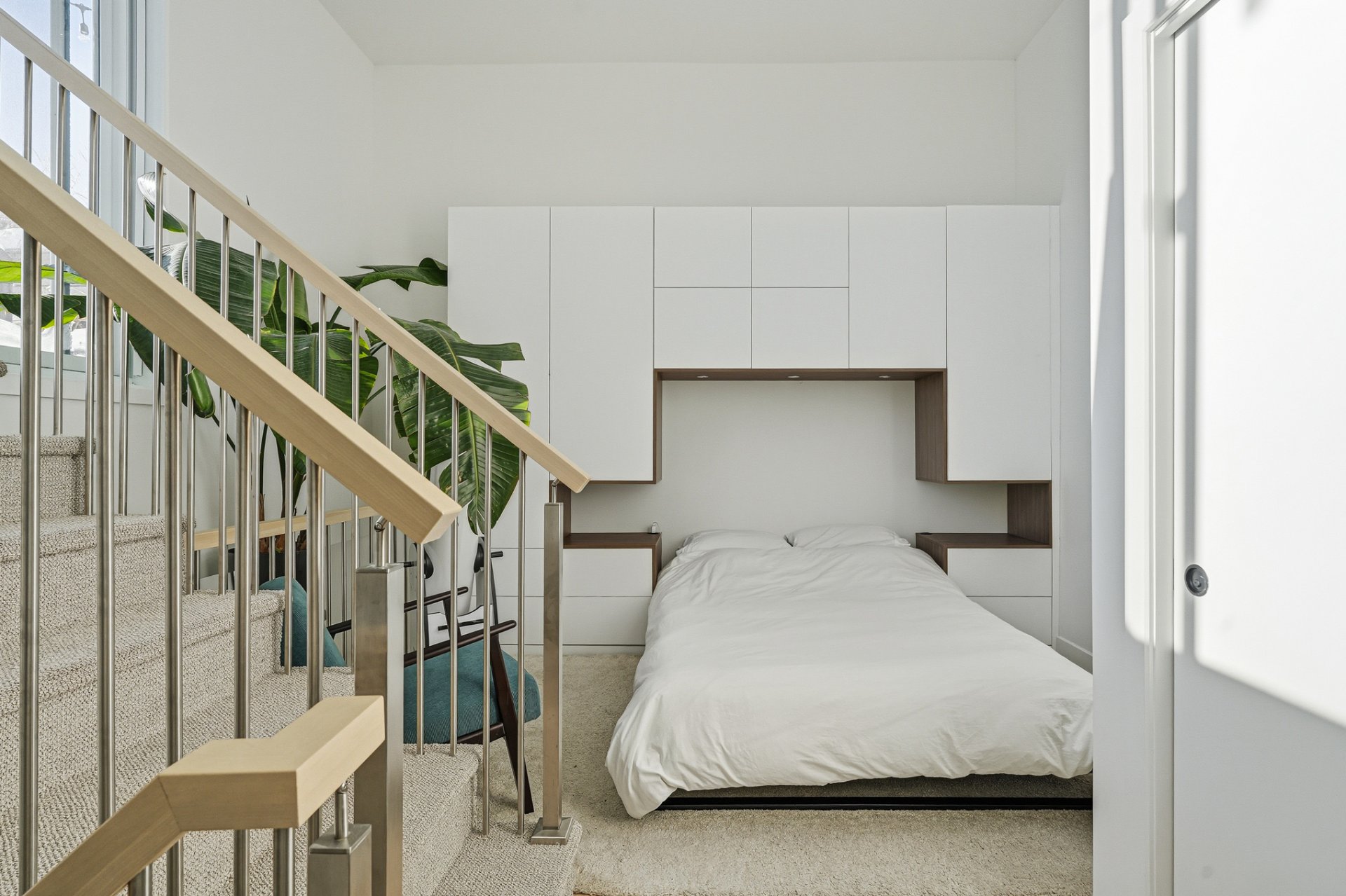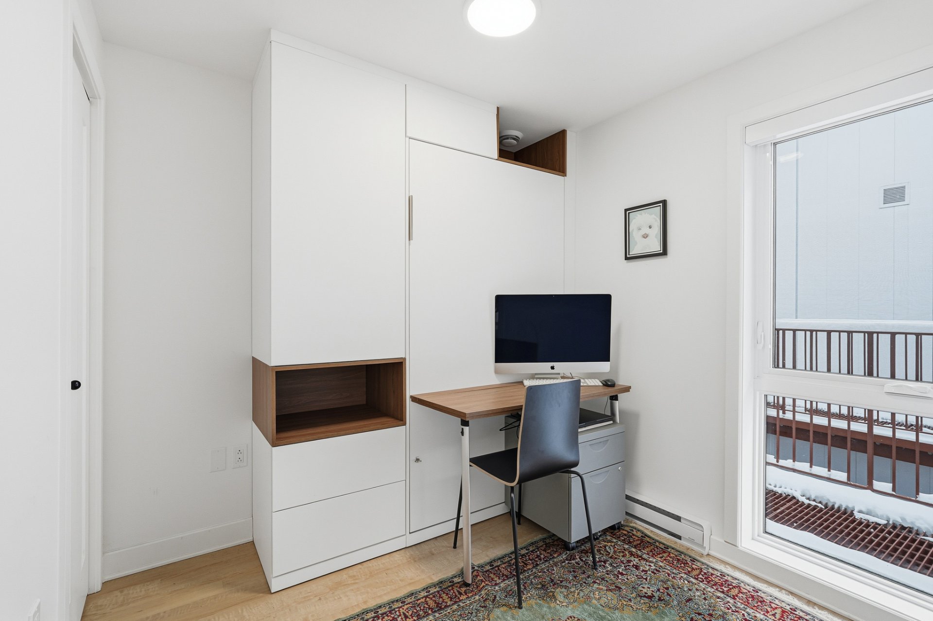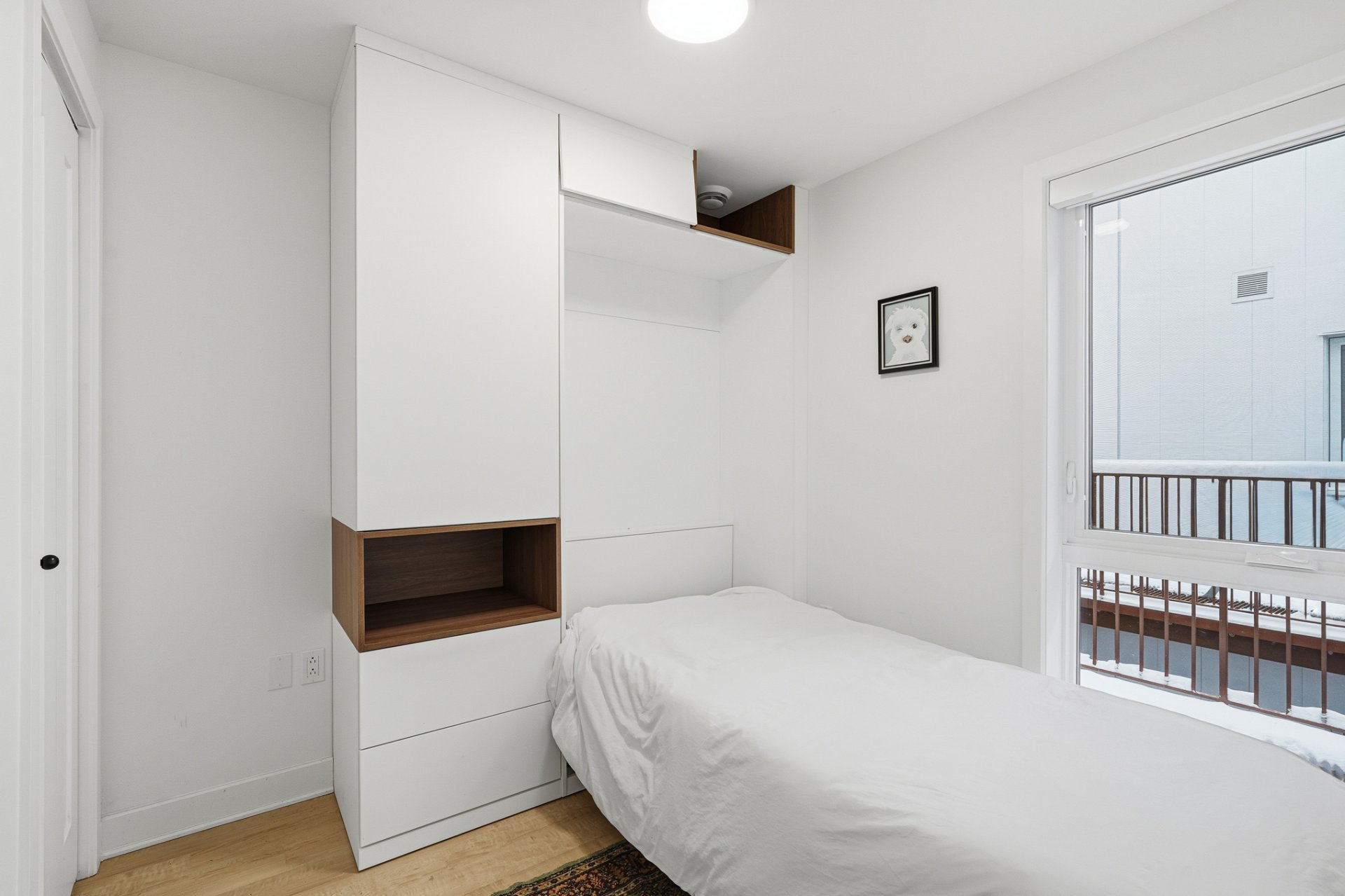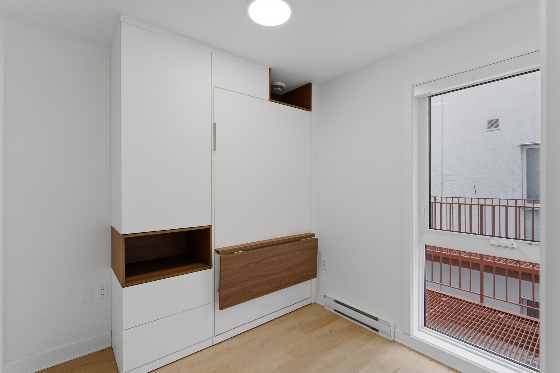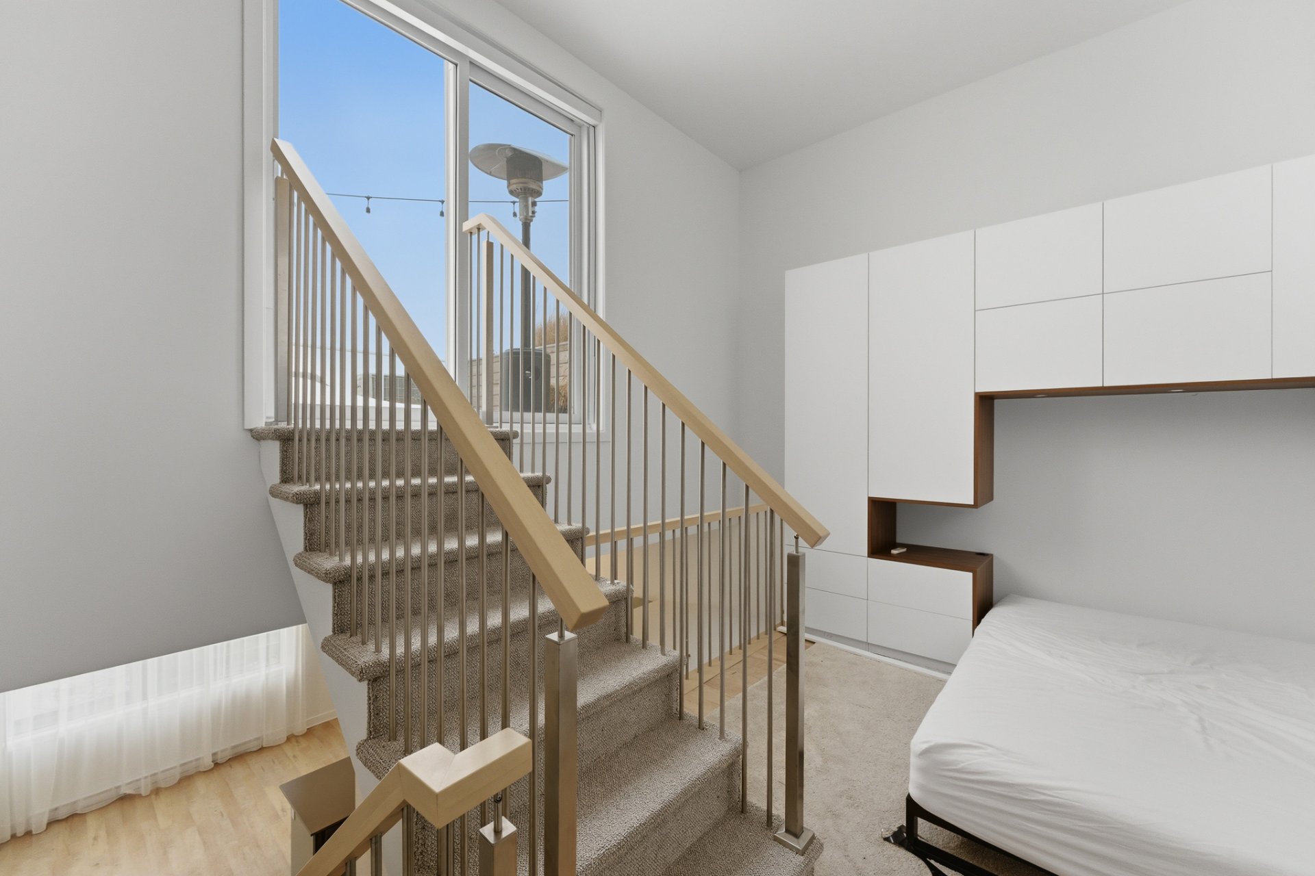 - Refrigerator, stove, dishwasher, washer, dryer, curtains and electric blinds. Primary bedroom: wall-mounted storage modules installed above a fixed bed, including a queen-size bed base and queen mattress. Secondary bedroom: wall-mounted Murphy bed unit with integrated storage and a built-in desk module, Terrace furniture: sectional sofa with cushions and patio heater.