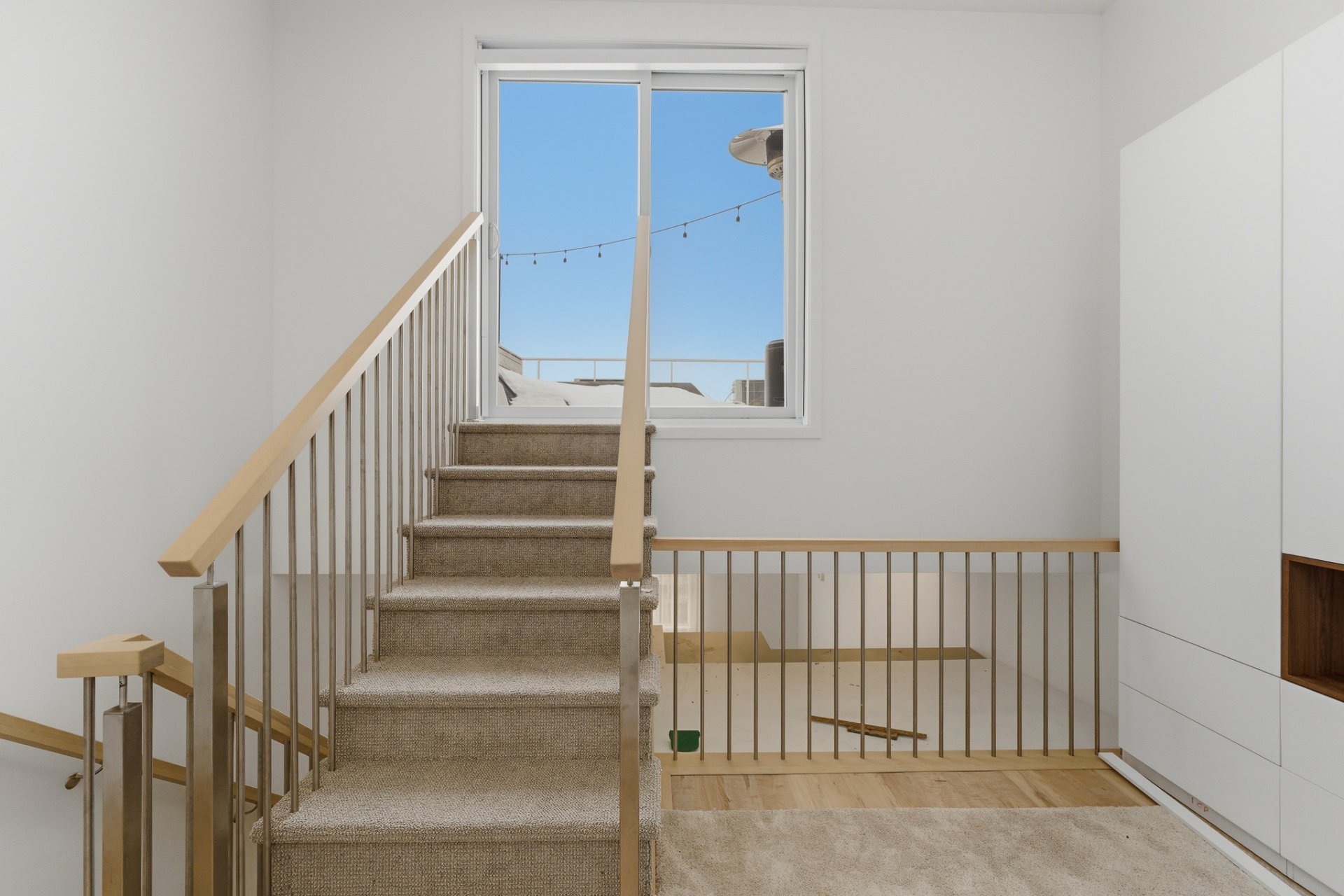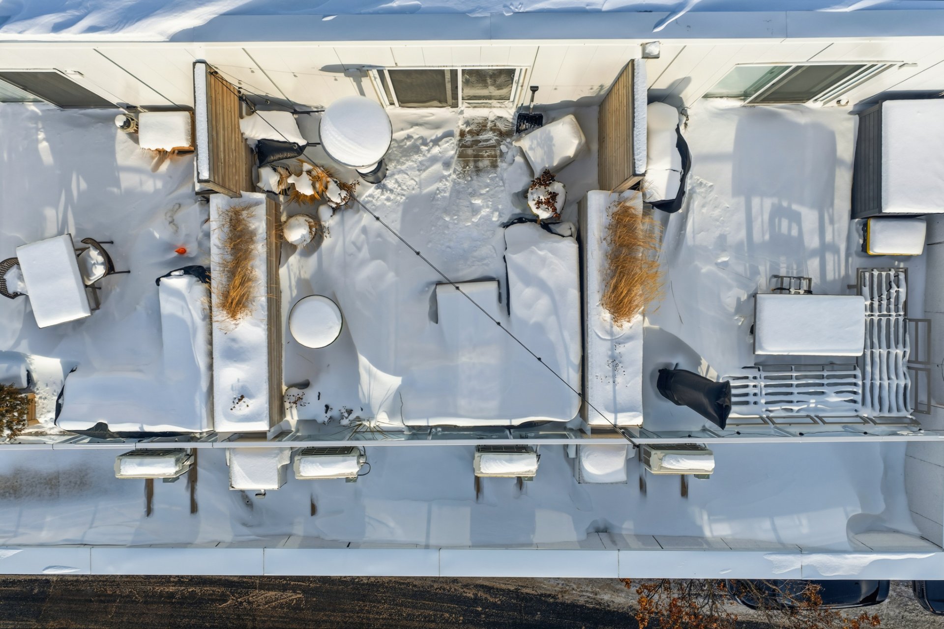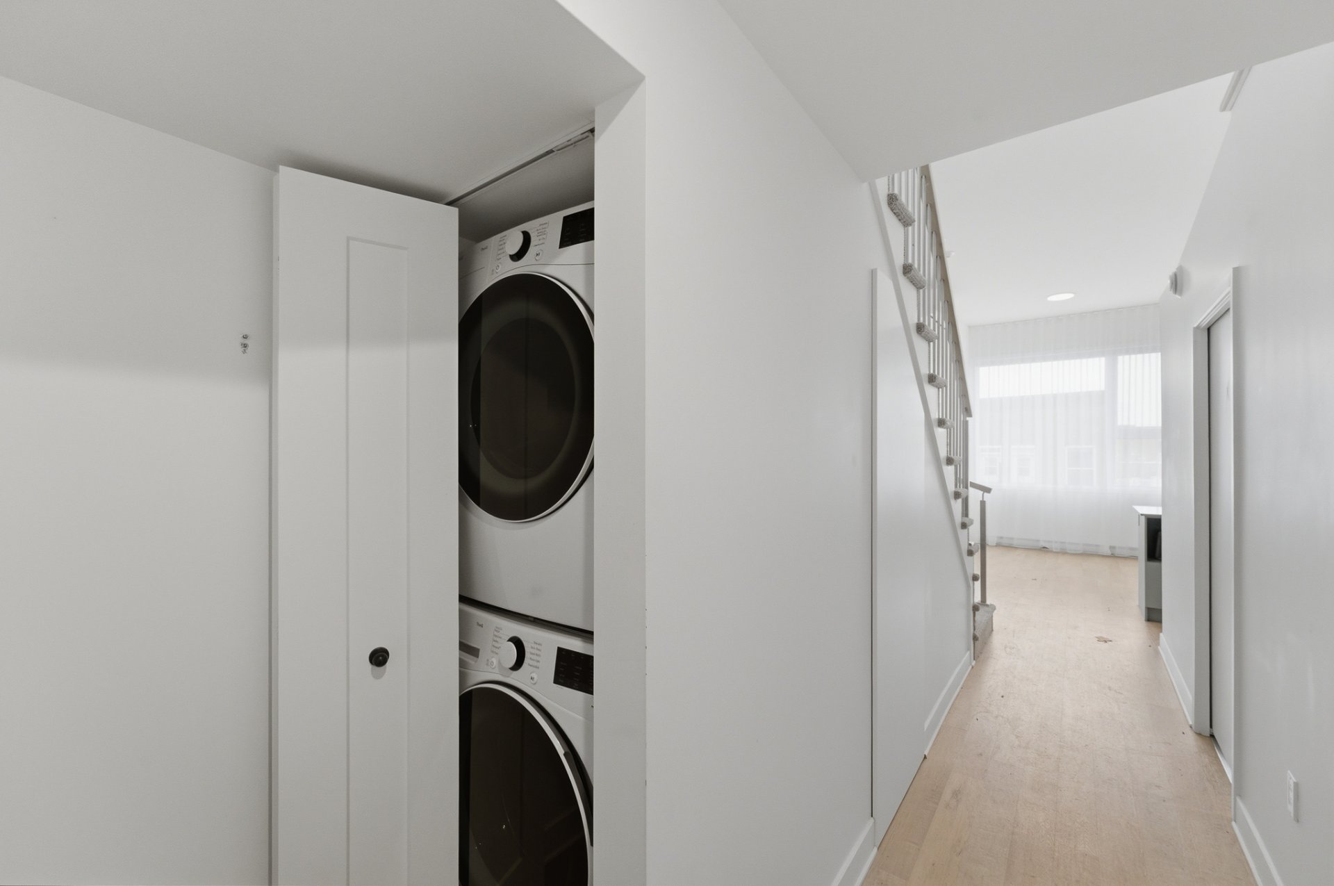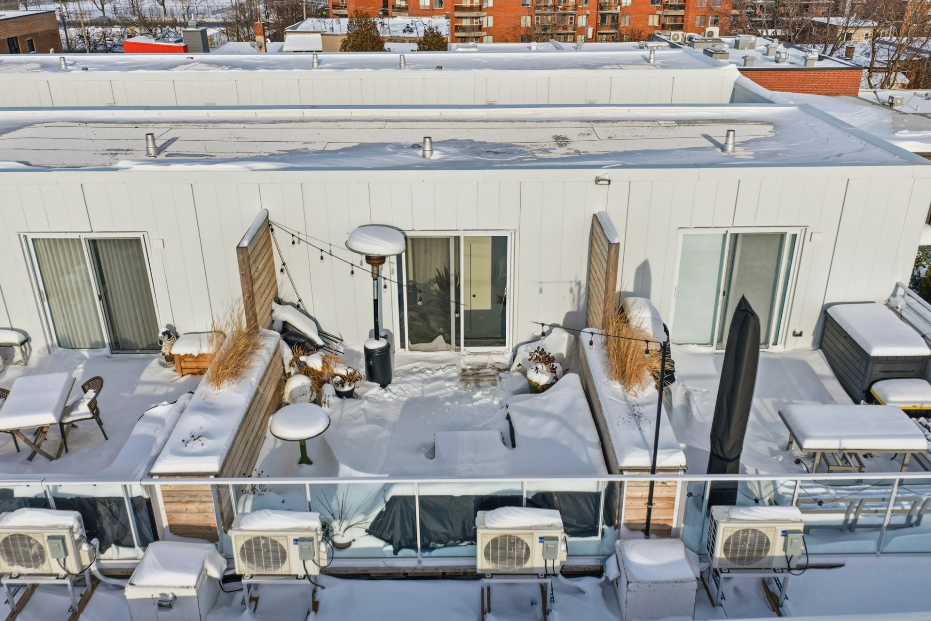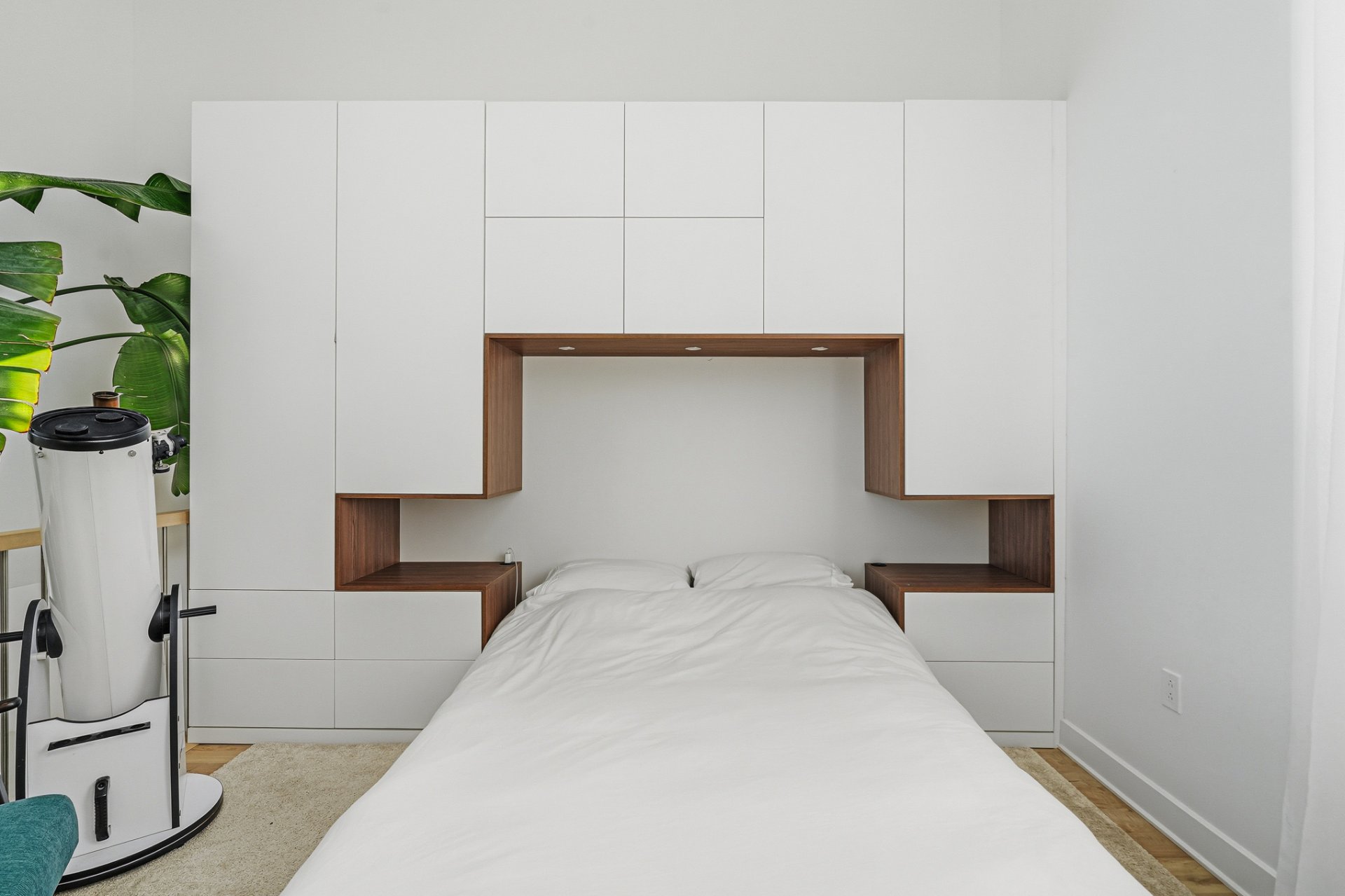 - Refrigerator, stove, dishwasher, washer, dryer, curtains and electric blinds. Primary bedroom: wall-mounted storage modules installed above a fixed bed, including a queen-size bed base and queen mattress. Secondary bedroom: wall-mounted Murphy bed unit with integrated storage and a built-in desk module, Terrace furniture: sectional sofa with cushions and patio heater.