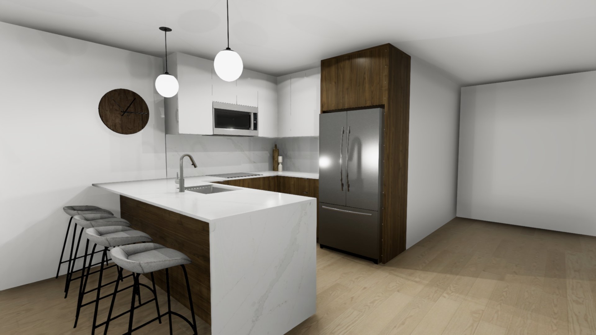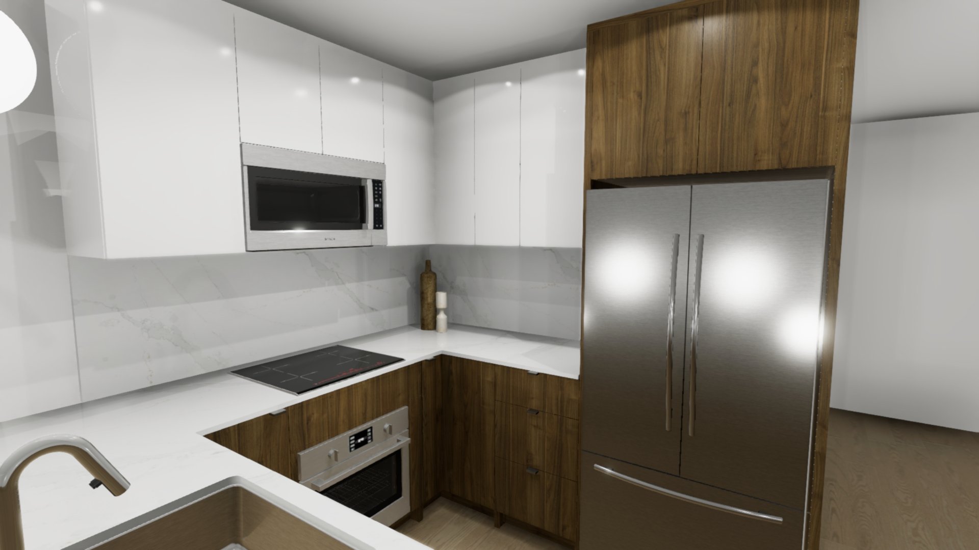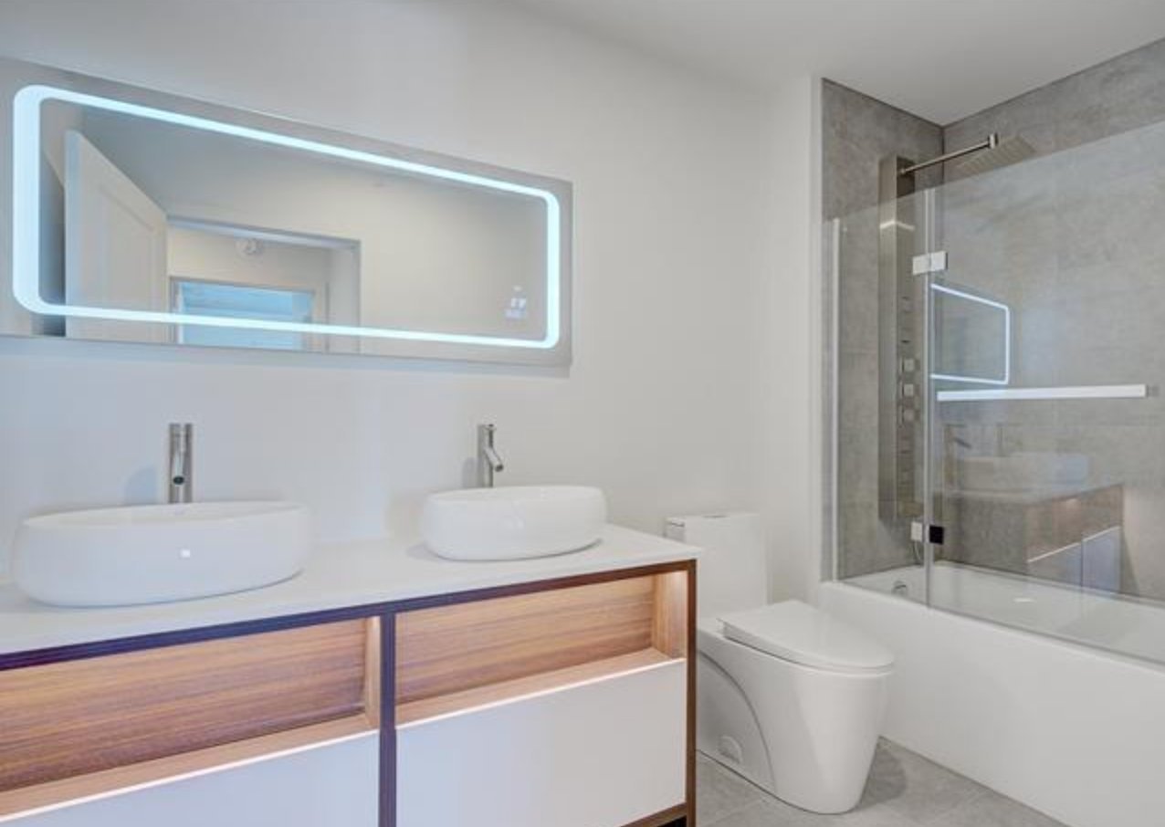 - LED-lit kitchen with quartz countertops