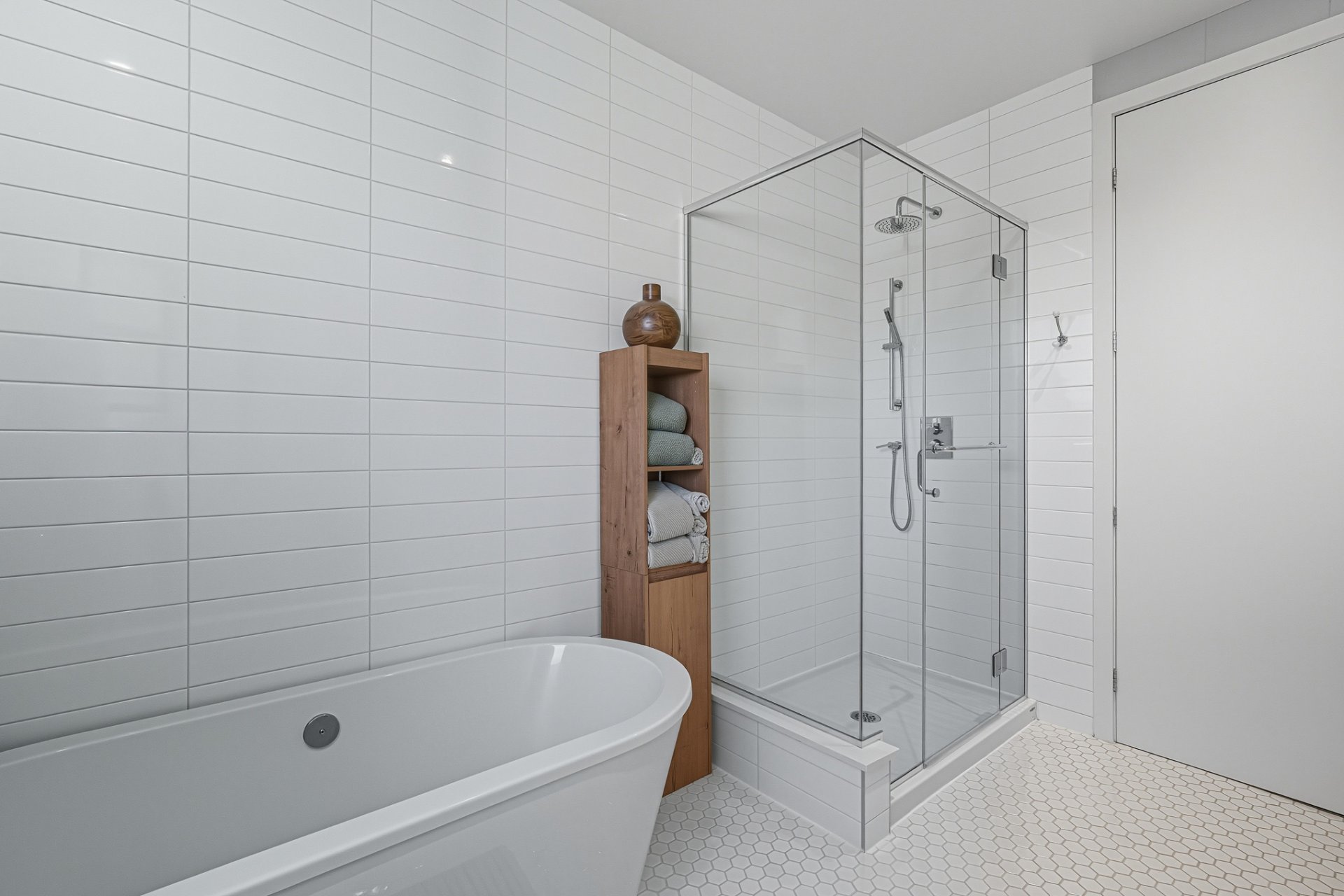 The bathroom exudes timeless refinement, with distinct spaces for the walk-in shower and the freestanding bathtub.