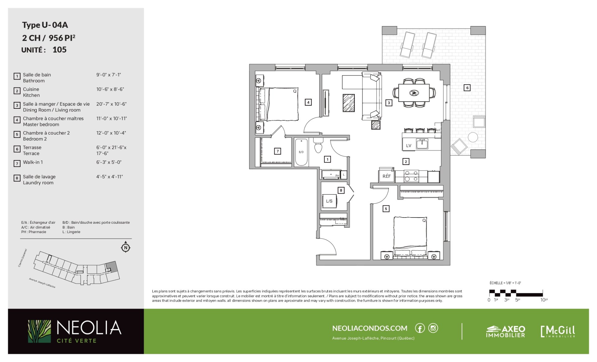 NEOLIA CITÉ VERTE - Nouveau projet de condos en béton armé à Pincourt. Phase 1, condo #105 orienté Est avec terrasse en coin. Occupation immédiate. Inclut 1 stationnement intérieur, 1 rangement, électroménagers Energy Star, laveuse/sécheuse, comptoirs en quartz, planchers SPC, dosseret en céramique, climatisation murale de type thermopompe, armoire à pharmacie et lingerie. À deux pas des commerces, écoles, transport, parcs et pistes cyclables. Espaces communs : piscine sur le toit avec BBQ, gym, espace de travail avec Wi-Fi, lounge et grande cour paysagée.