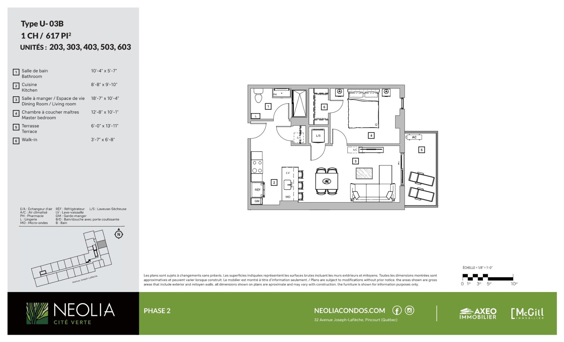 NEOLIA CITÉ VERTE - Nouveau projet de condos en béton armé à Pincourt. Livraison de la Phase 2 à partir de l'hiver 2027/2028. Condo #303 situé en Phase 2, 1 chambre, 1 salle de bain avec walk-in, orienté est. Inclut 1 stationnement extérieur, 1 rangement, électroménagers Energy Star, laveuse/sécheuse, comptoirs en quartz, planchers SPC, dosseret en céramique, climatisation murale de type thermopompe, armoire à pharmacie et lingerie. À deux pas des commerces, écoles, transport, parcs et pistes cyclables. Espaces communs : piscine sur le toit avec BBQ, gym, espace de travail avec Wi-Fi, lounge et grande cour paysagée.