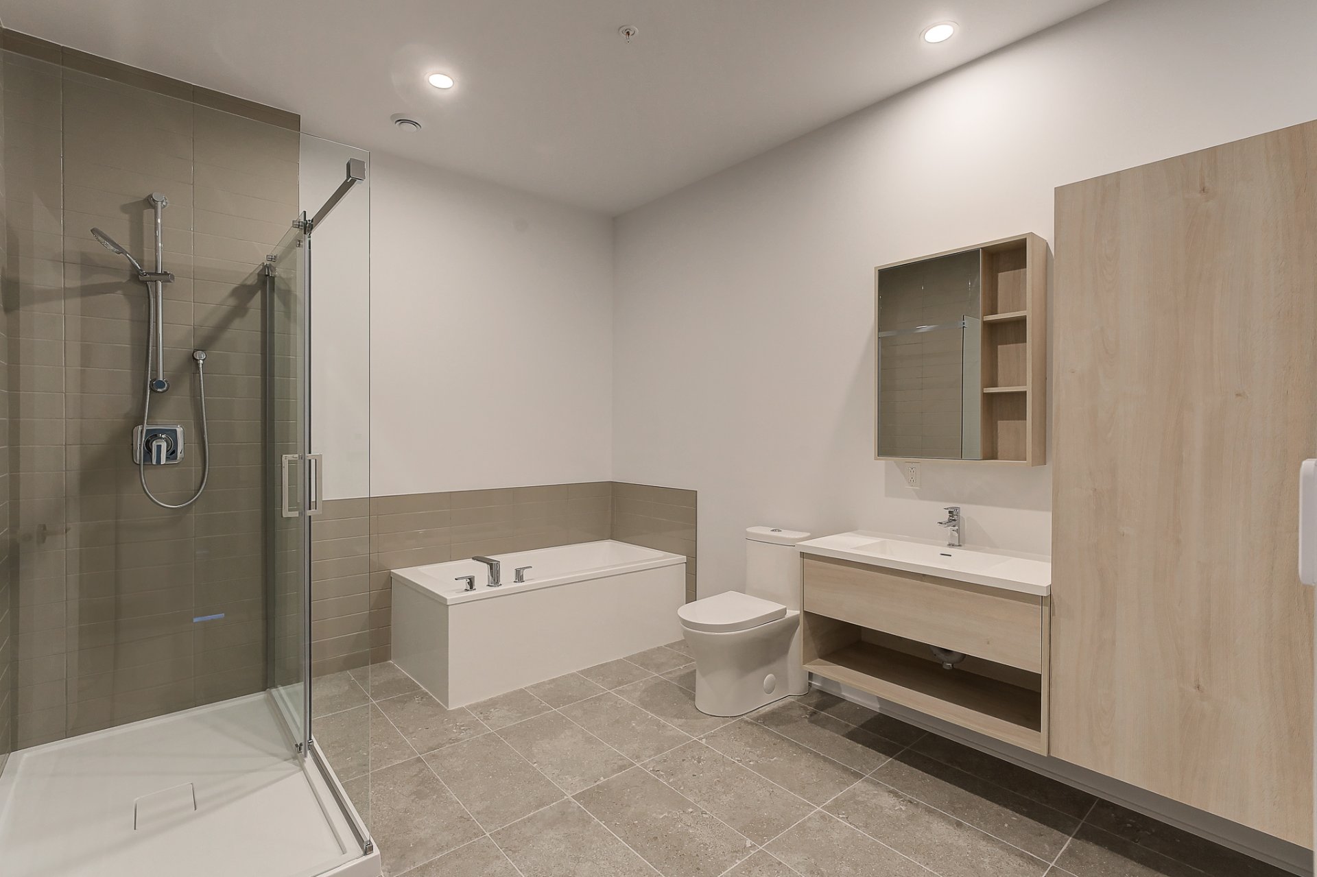 - 1 stationnement intérieur, 1 rangement dans le garage, comptoirs de quartz, plancher d'ingénierie SPC, dosseret en céramique, armoire pharmacie, climatisation murale style thermopompe, éclairage LED sous les armoires.