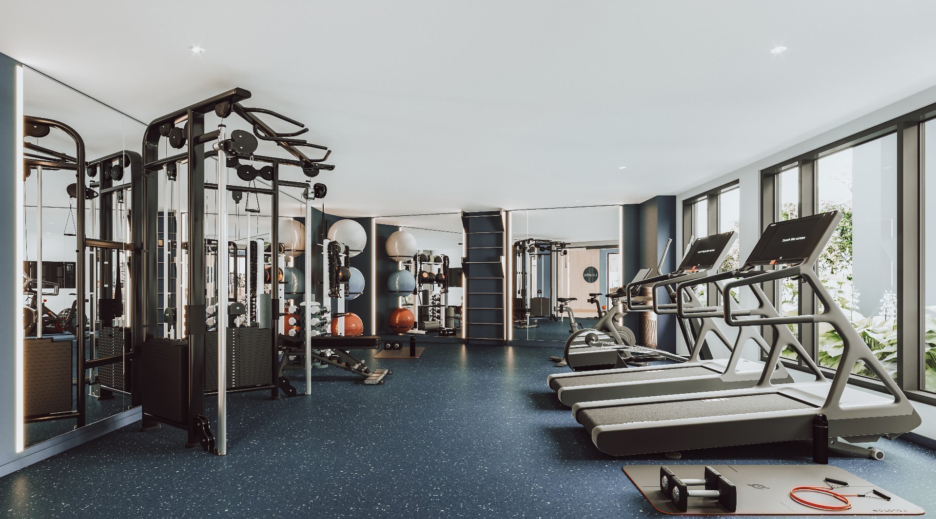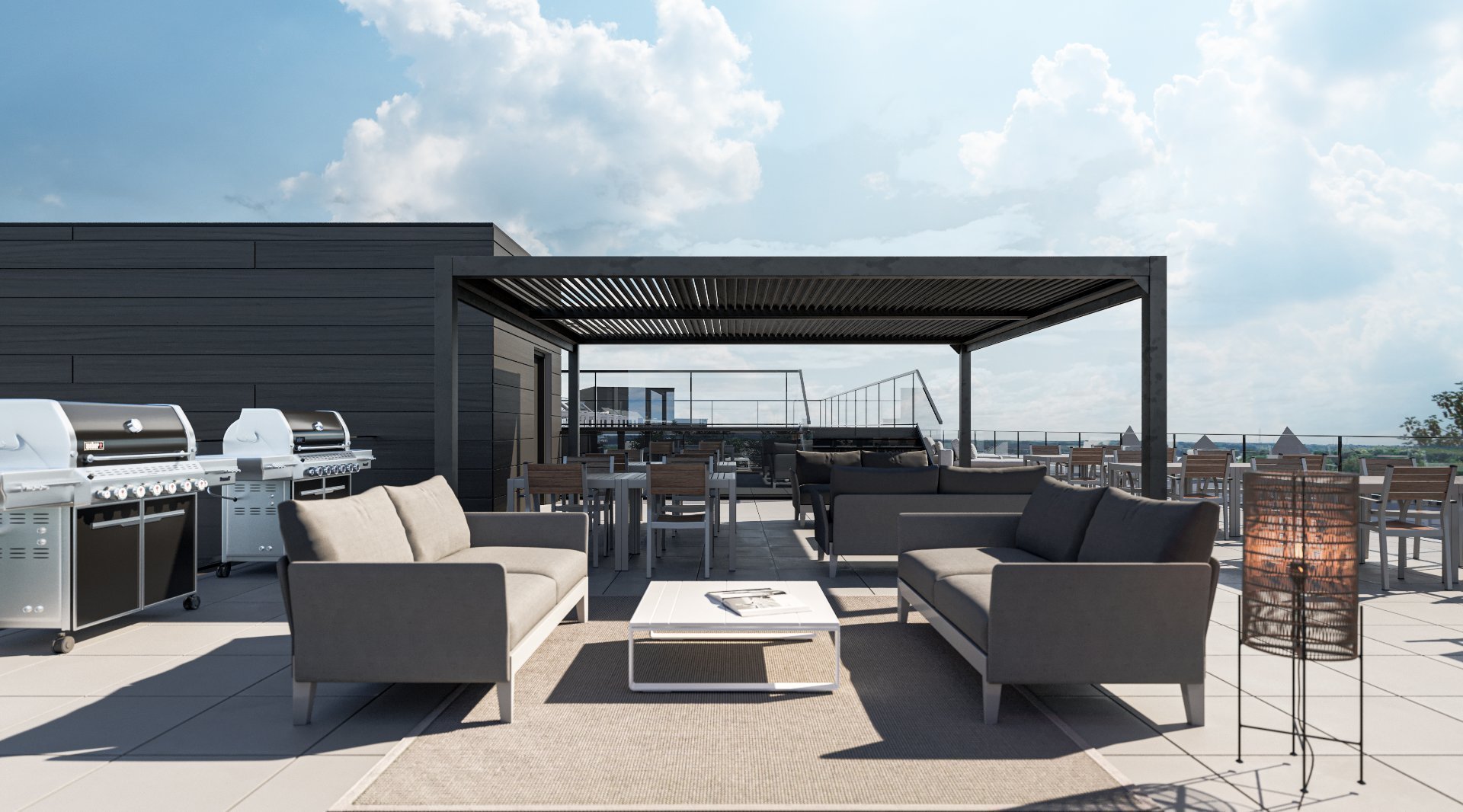 Espaces communs comprenant une piscine sur le toit avec terrasse BBQ, salle d'entraînement complète, espace de télé-travail avec WIFI, lounge ainsi qu'une cour intérieure de 95 000 pi2 incluant un espace d'entraînement extérieur, un terrain de pétanque, un parc à chien, bancs extérieurs et un jardin communautaire.