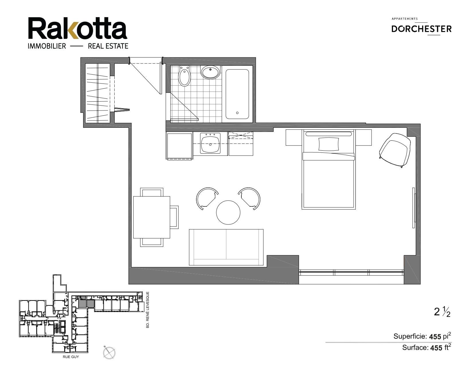 Pour toute information ou pour une visite, veuillez envoyer un courriel à: [email protected] Bienvenue aux Appartements Dorchester. Bâtiment et appartements nouvellement rénovés prêts pour vous. Studio ENTIÈREMENT MEUBLÉ de 455 pc. à louer. TOUT est inclus : eau chaude, électricité, chauffage, AC et Internet haute vitesse, piscine intérieure, gym, espace lounge. Garde de sécurité sur place 24/7. Non Inclus : Meuble, Laveuse/Sécheuse (Salle de Lavage $), Lave-Vaisselle. Seulement les chats sont acceptés, pas de chiens. Emménagez, déballez et faites comme chez vous. D'autres appartements sont disponibles.