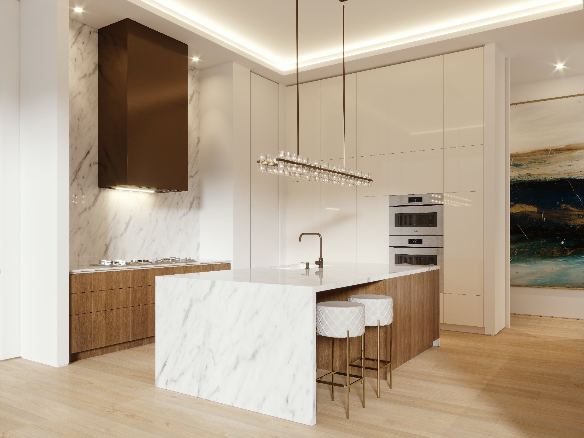 - Réfrigérateur, cuisinière avec hotte, lave-vaisselle et micro-ondes.