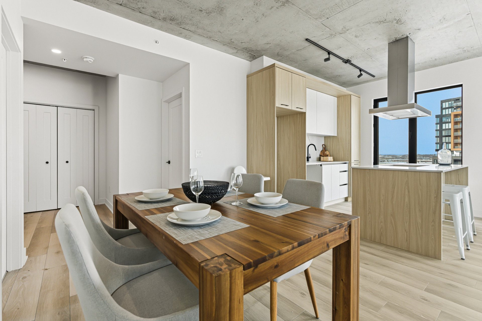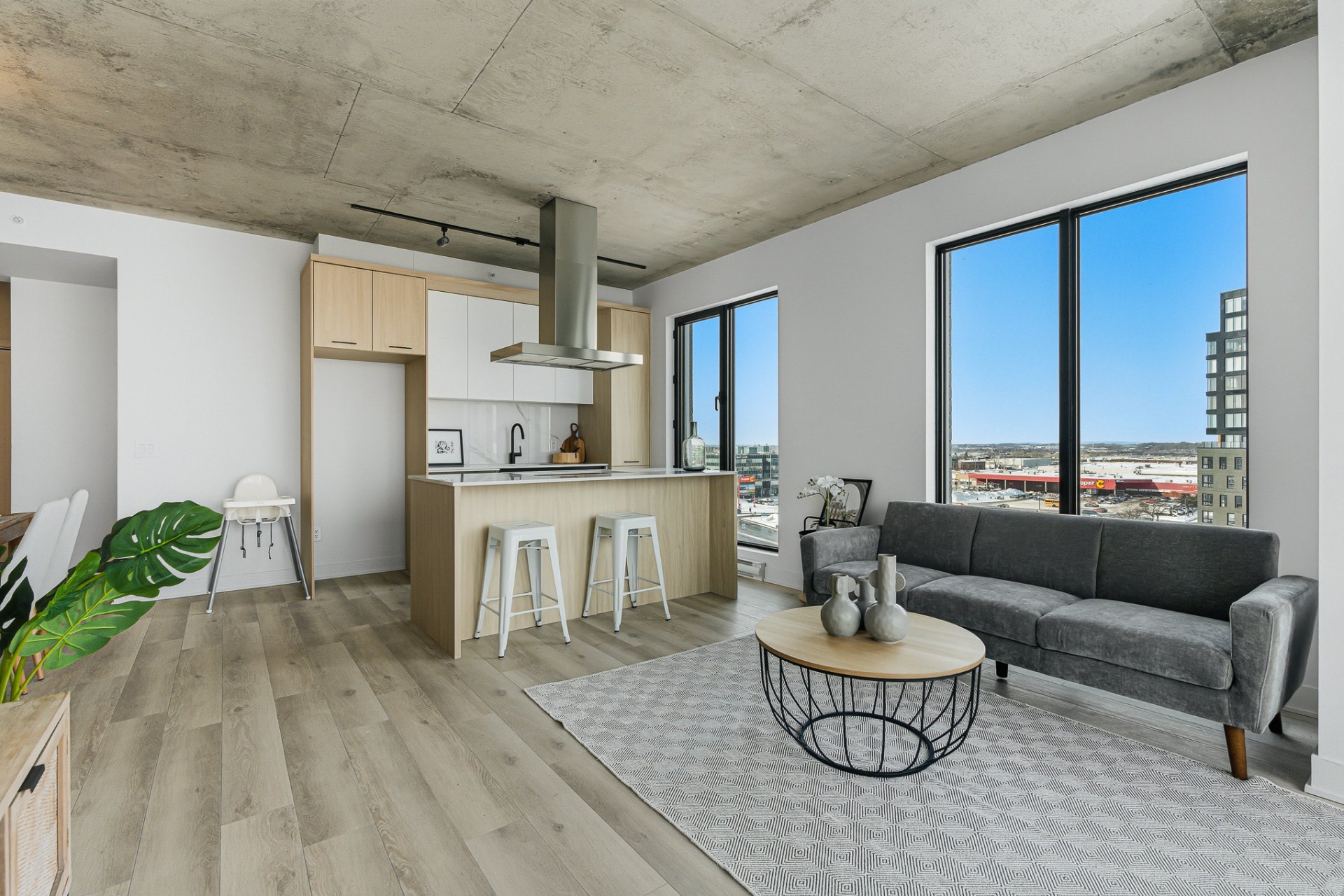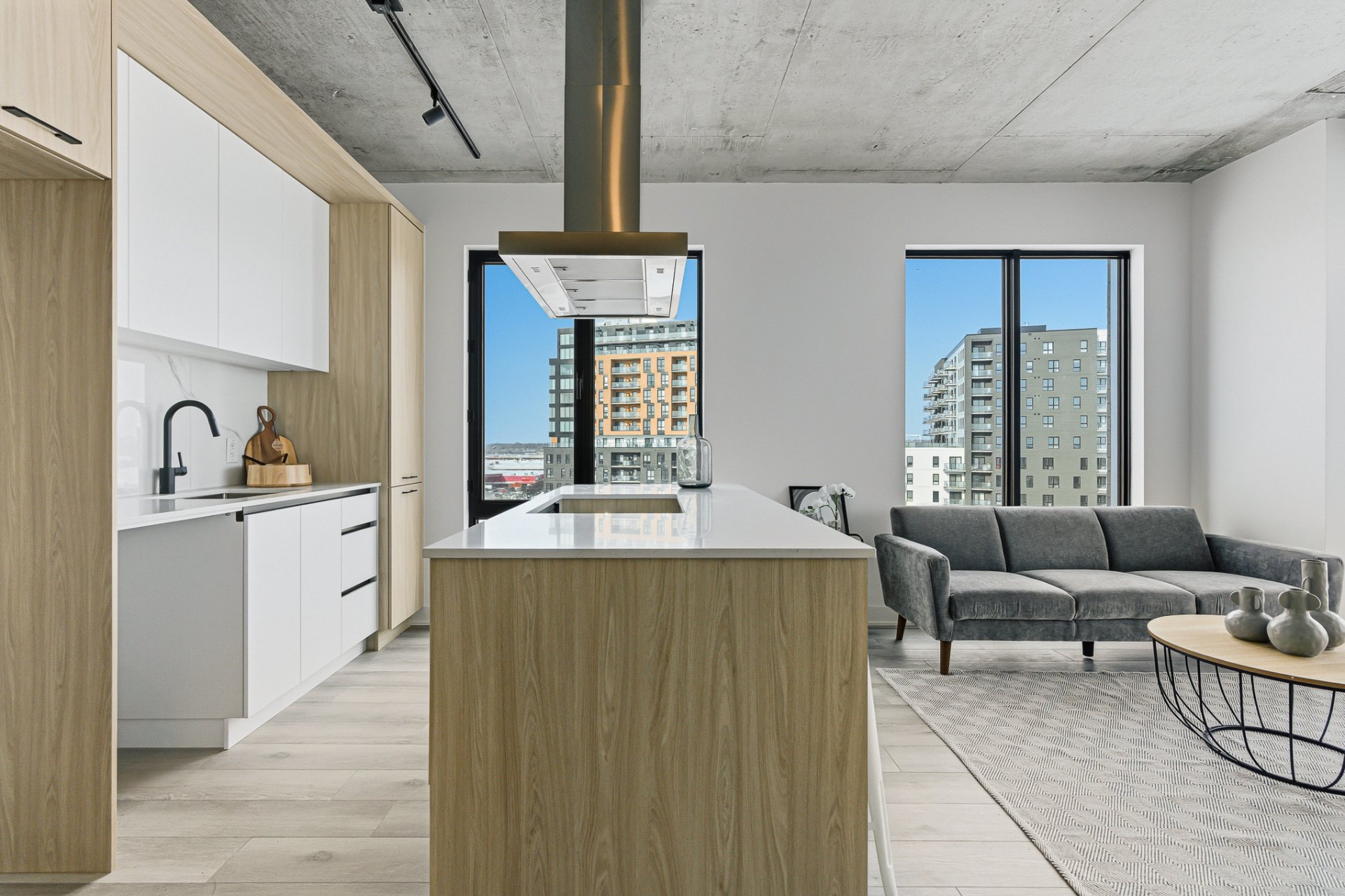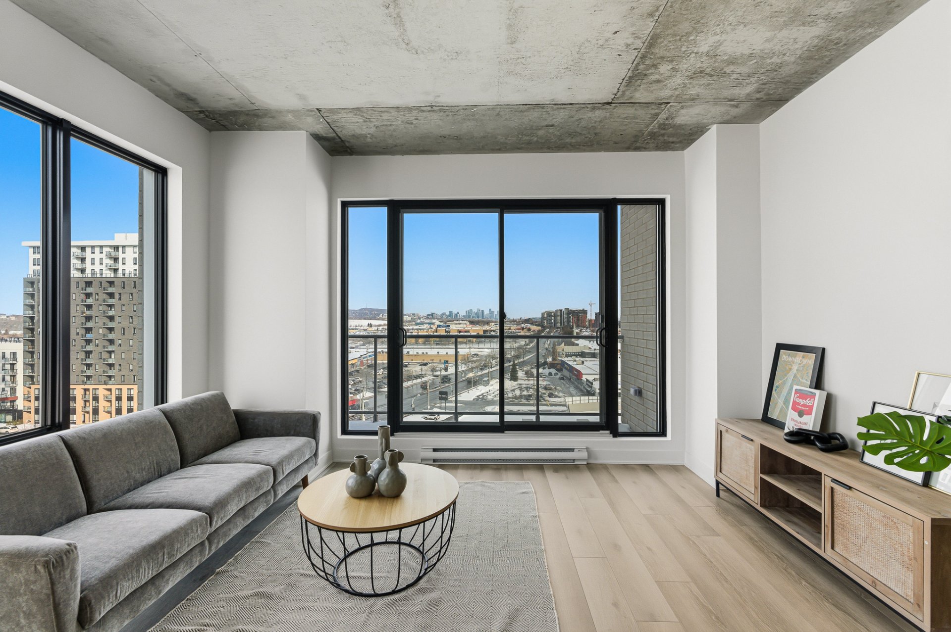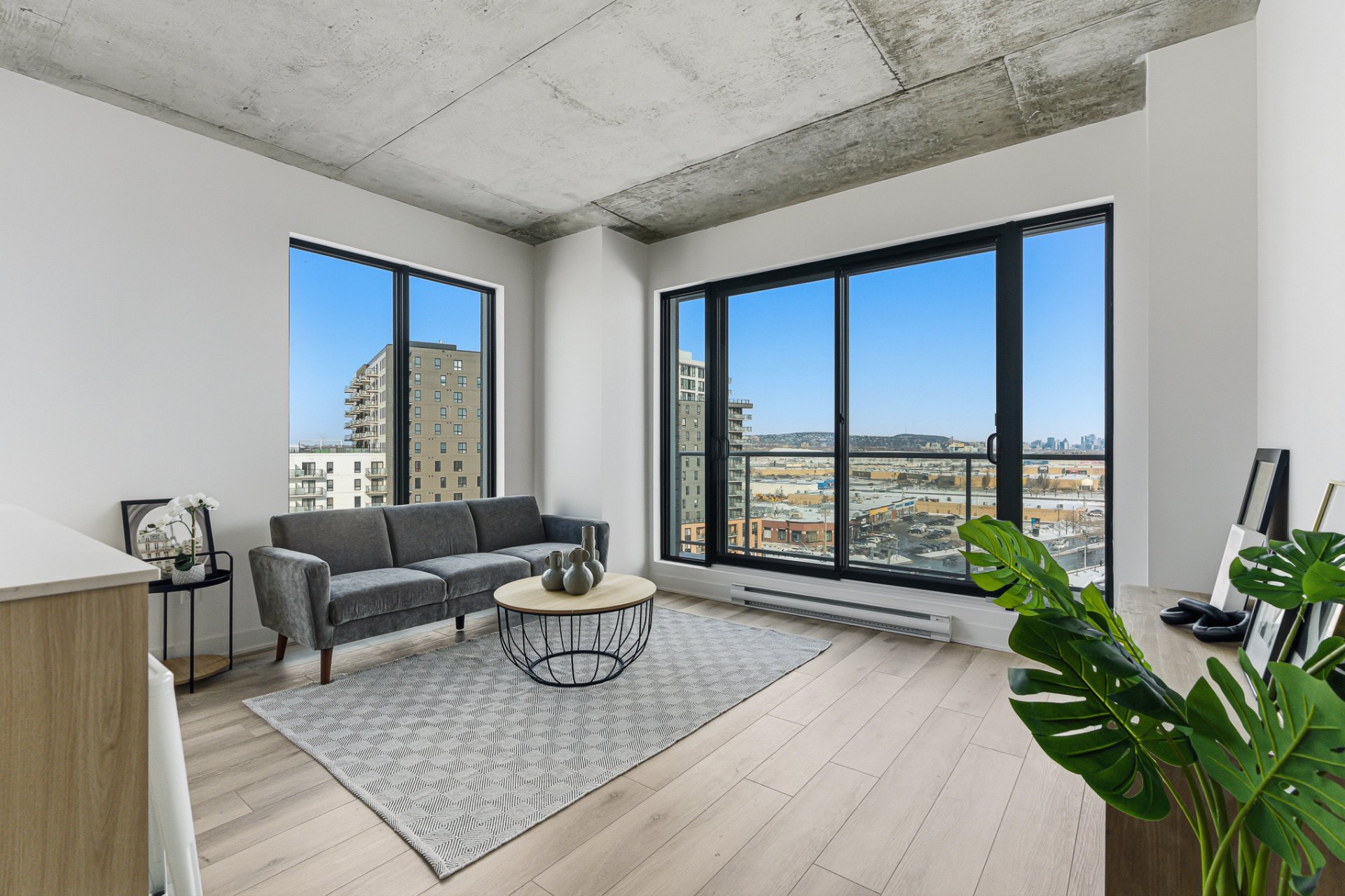 Insonorisation supérieur avec une structure de béton armé de 9'', plafond exposé béton entre 9' et 13' de hauteur, 16 étages, 3 ascenseurs à haute vitesse, chute à déchets ainsi que 3 étages de stationnement intérieur.