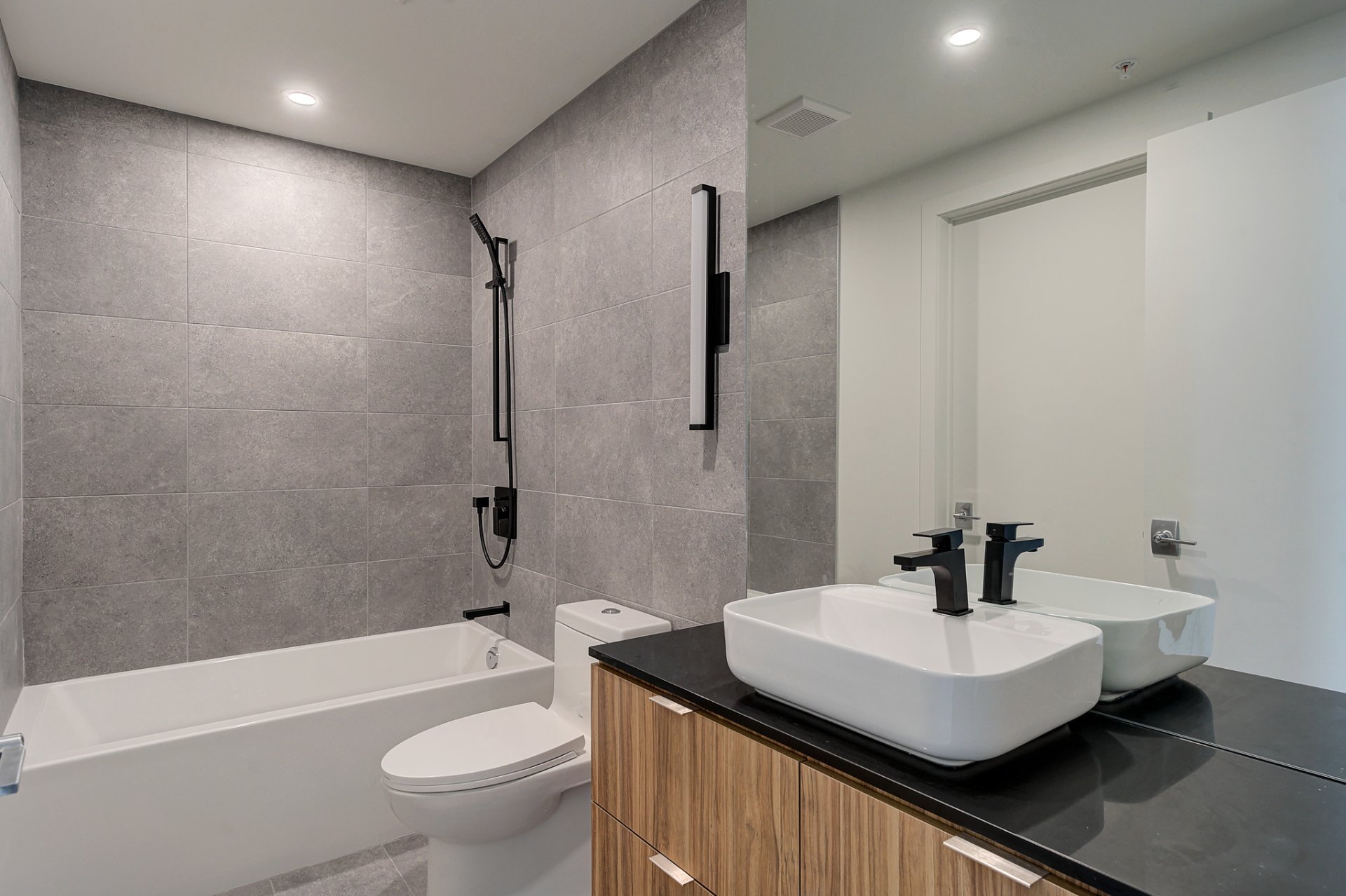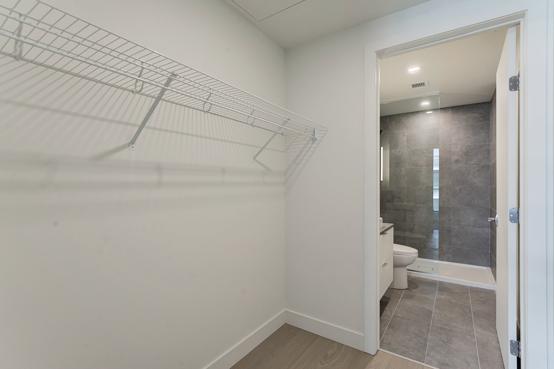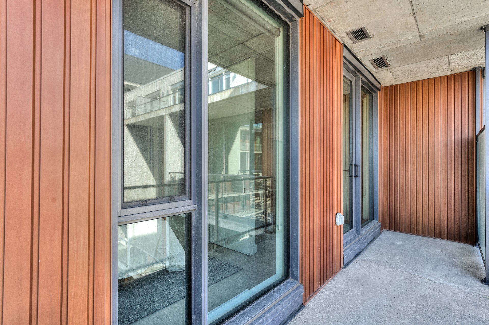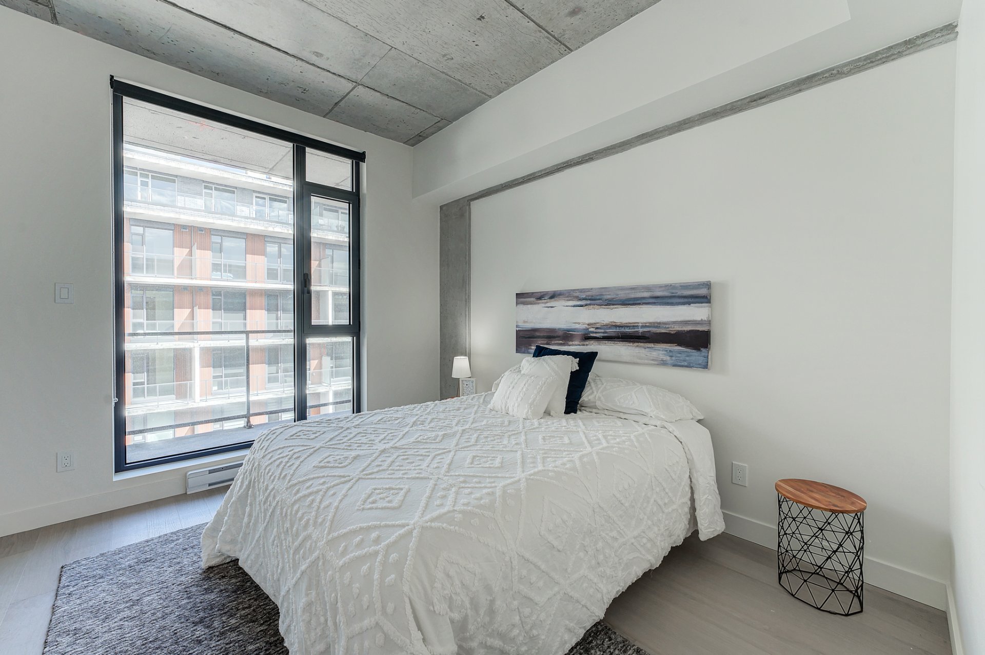 Grand 2 chamcres, 2 salles de Bain dans le cour interieur, avec de hauts plafonds 9', fenêtres du plancher au plafond et l'air climatisé centrale. Chambre principale lumineuse avec walk-in et salle de bain privée avec grande douche en verre. Grand Balcon, 6 electros, Garage interieur et les stores, pret a habiter.
