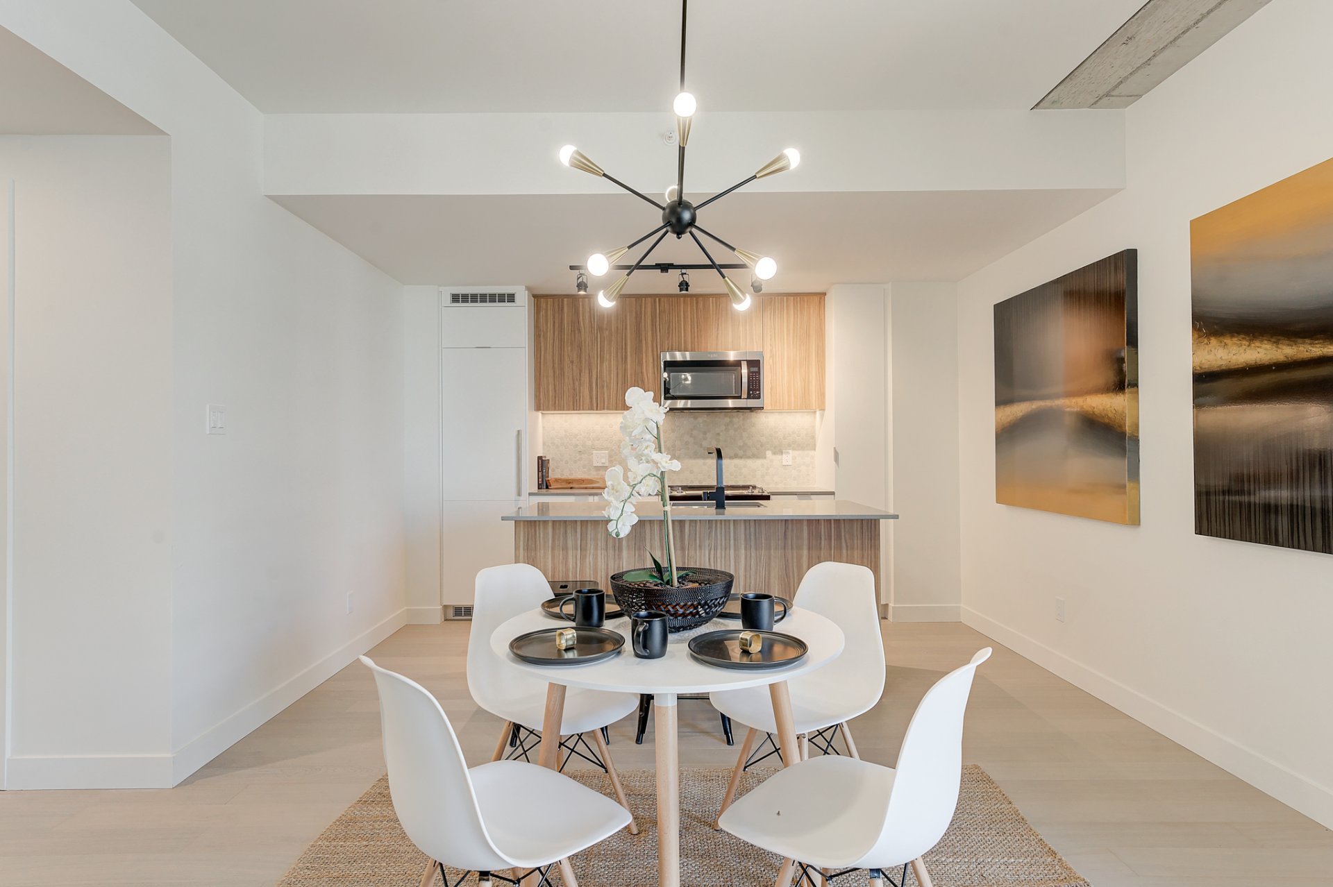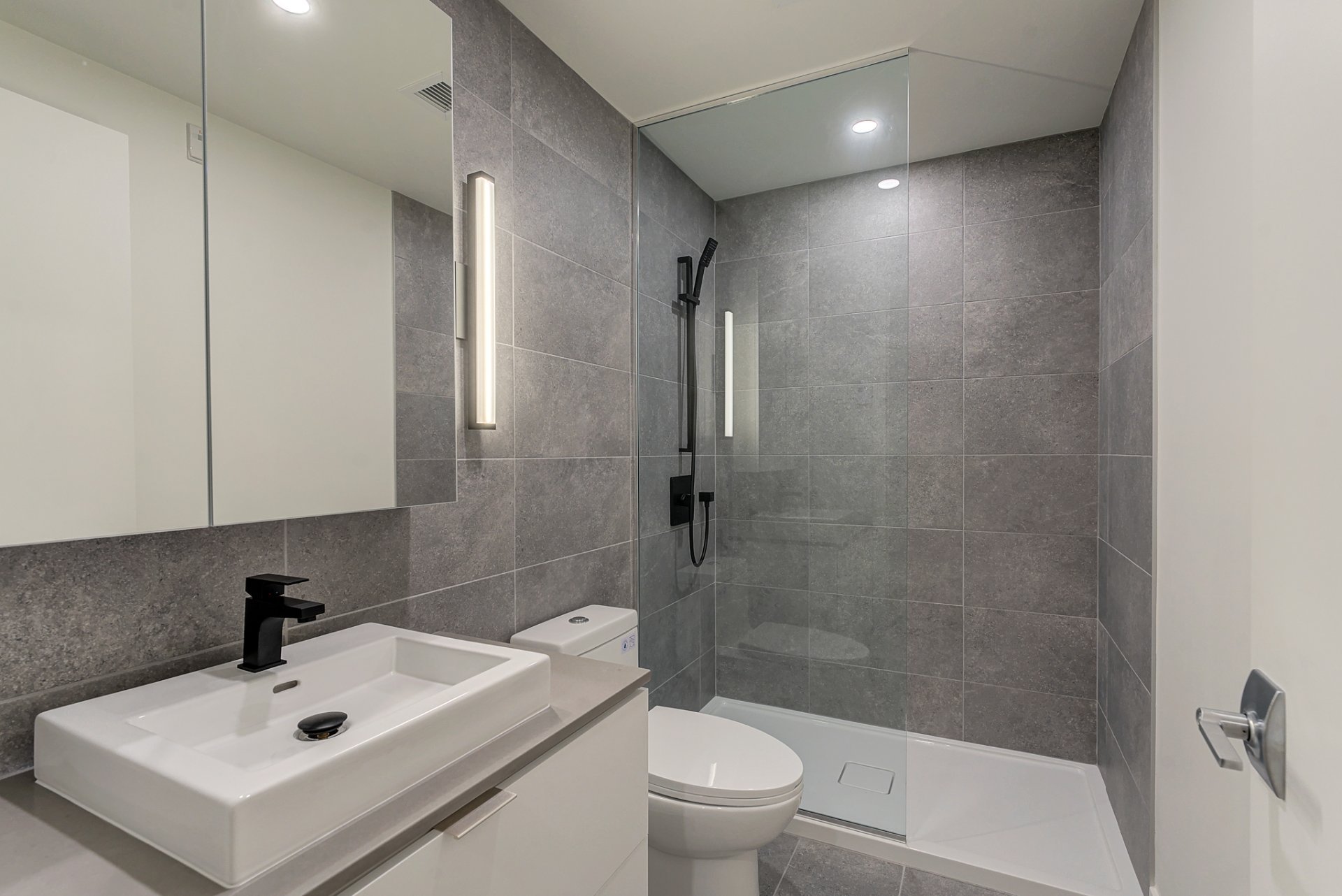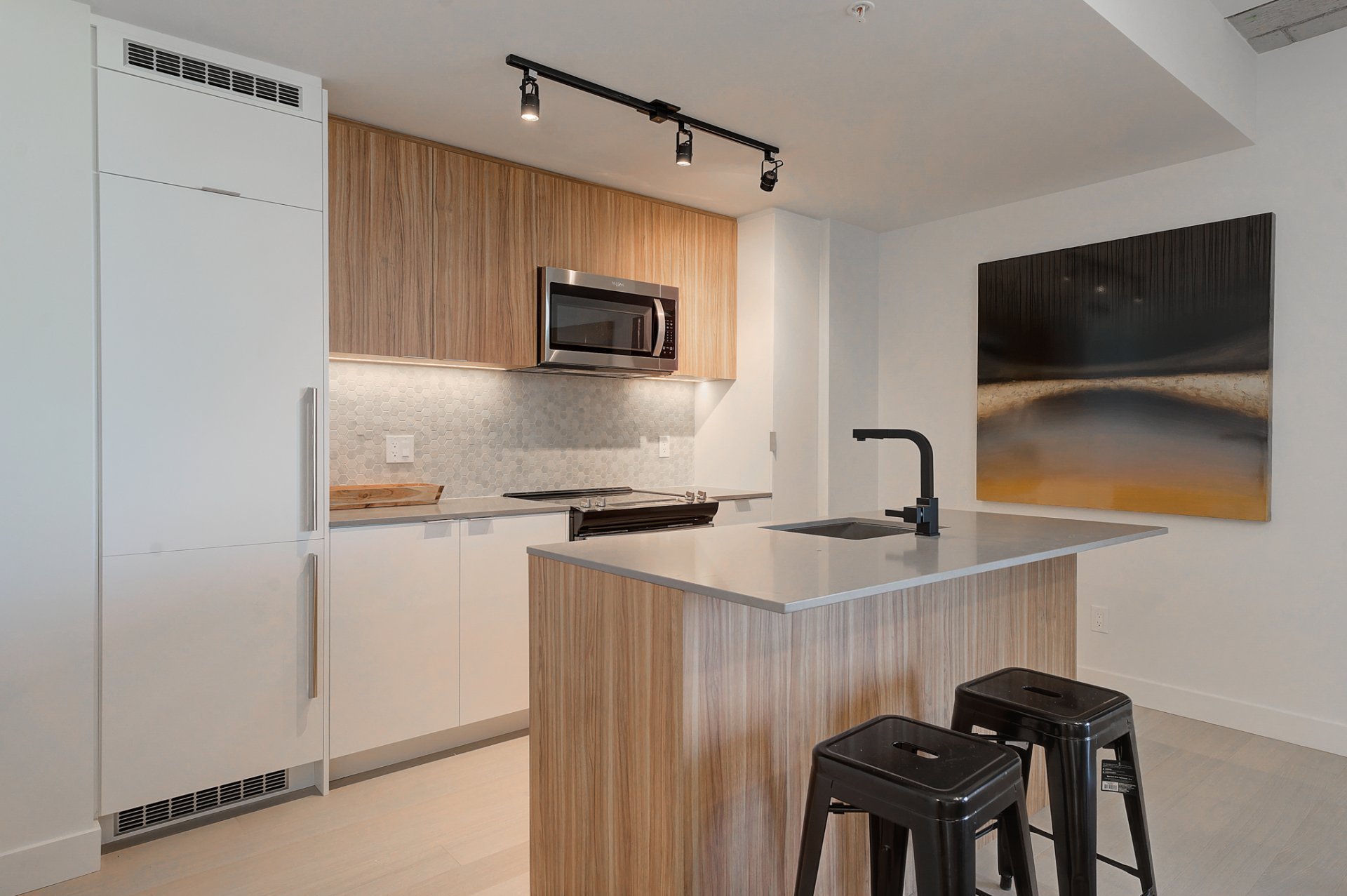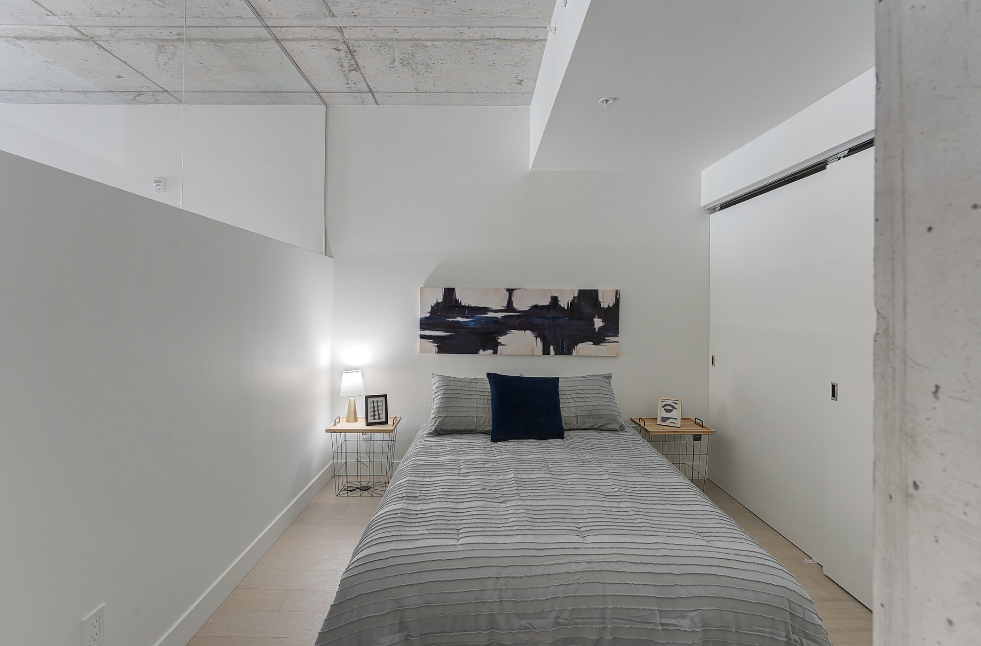 Grand 2 chamcres, 2 salles de Bain dans le cour interieur, avec de hauts plafonds 9', fenêtres du plancher au plafond et l'air climatisé centrale. Chambre principale lumineuse avec walk-in et salle de bain privée avec grande douche en verre. Grand Balcon, 6 electros, Garage interieur et les stores, pret a habiter.