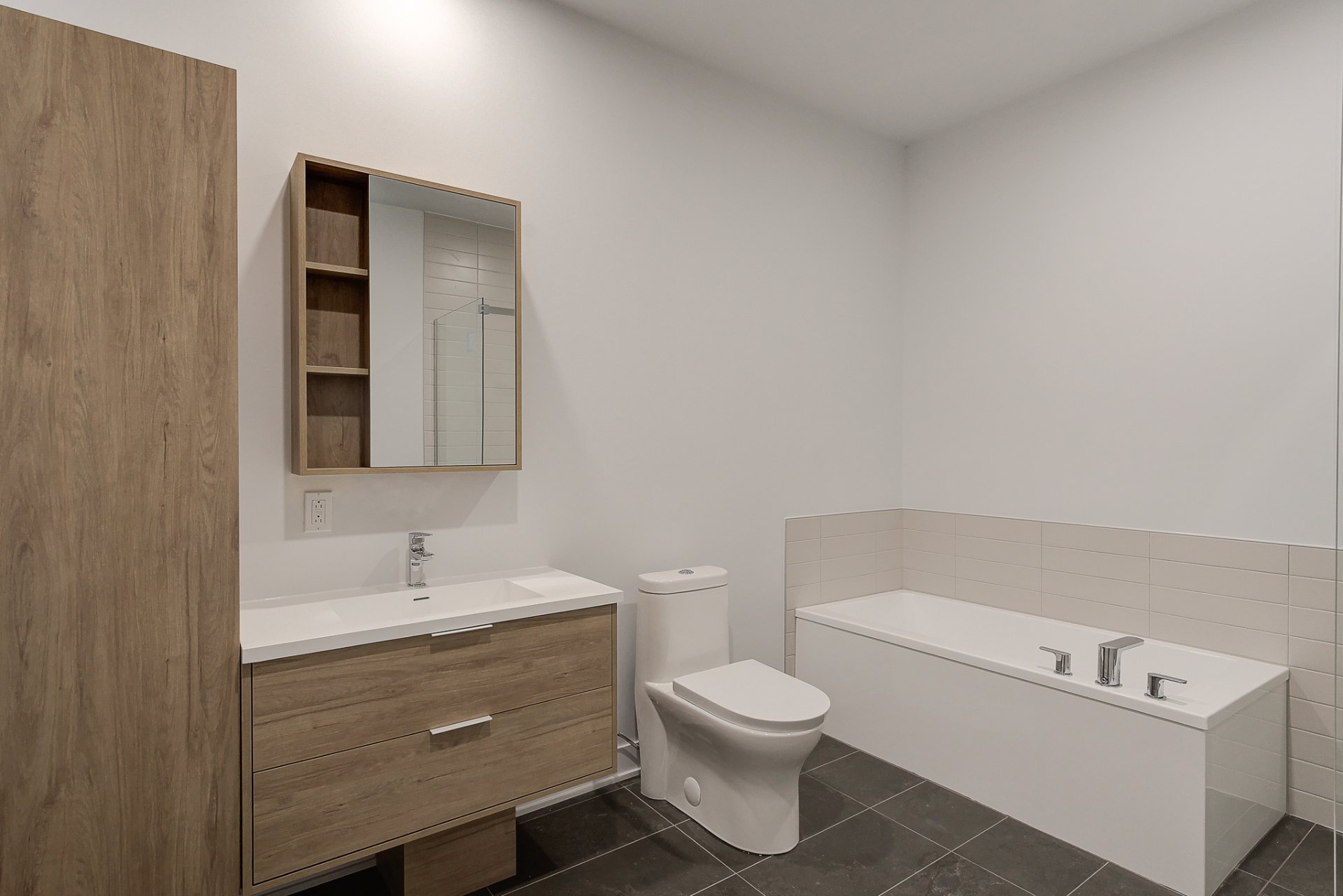 - 1 stationnement intérieur, 1 rangement dans le garage, comptoirs de quartz, plancher d'ingénierie SPC, dosseret en céramique, armoire pharmacie, climatisation murale style thermopompe, éclairage LED sous les armoires.