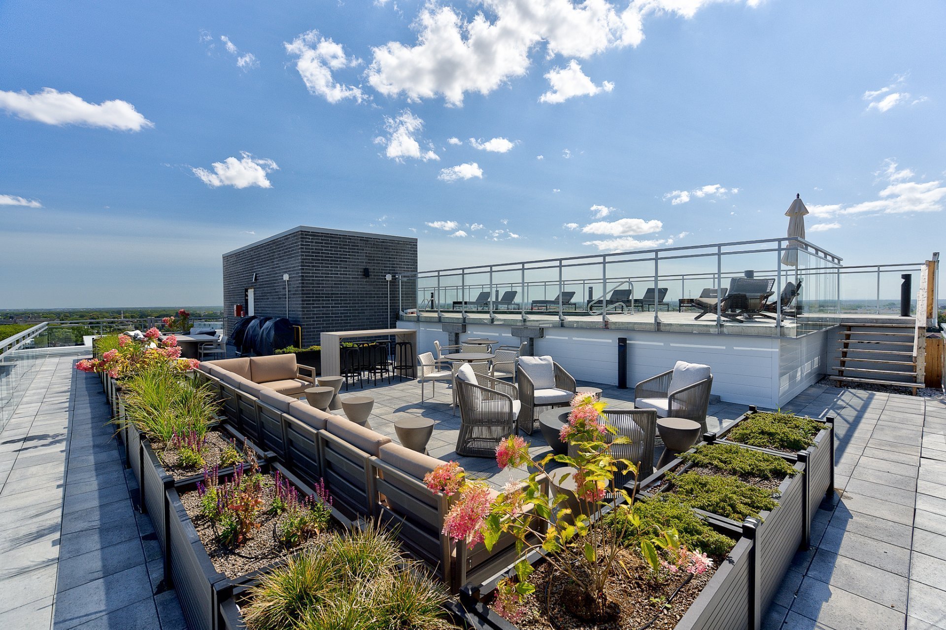 Aires communes telles qu'un gymnase intérieur avec accès d'un air d'entrainement extérieur, salle de yoga, salle télétravail avec WIFI et accès extérieur, lounge, piscine sur le toit avec terrasse attenante et BBQ, cour intérieure disposant d'une aire de détente.