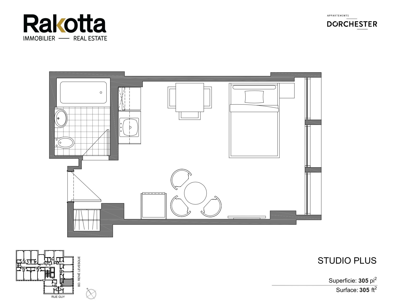 Pour toute information ou pour une visite, veuillez envoyer un courriel à: [email protected] Bienvenue aux Appartements Dorchester. Bâtiment et appartements nouvellement rénovés prêts pour vous. Studio de 305 pc. à louer. TOUT est inclus : eau chaude, électricité, chauffage, AC et Internet haute vitesse, piscine intérieure, gym, espace lounge. Garde de sécurité sur place 24/7. Non Inclus : Meuble, Laveuse/Sécheuse (Salle de Lavage $), Lave-Vaisselle. Seulement les chats sont acceptés, pas de chiens. Emménagez, déballez et faites comme chez vous. D'autres appartements sont disponibles.
